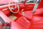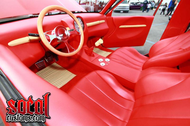 custom fiberglass panels and dash, cavalier seats -headrests, grunion fab shift knob, mini cooper speedo, Klassics Inc steering wheel. All wrapped in red vinyl