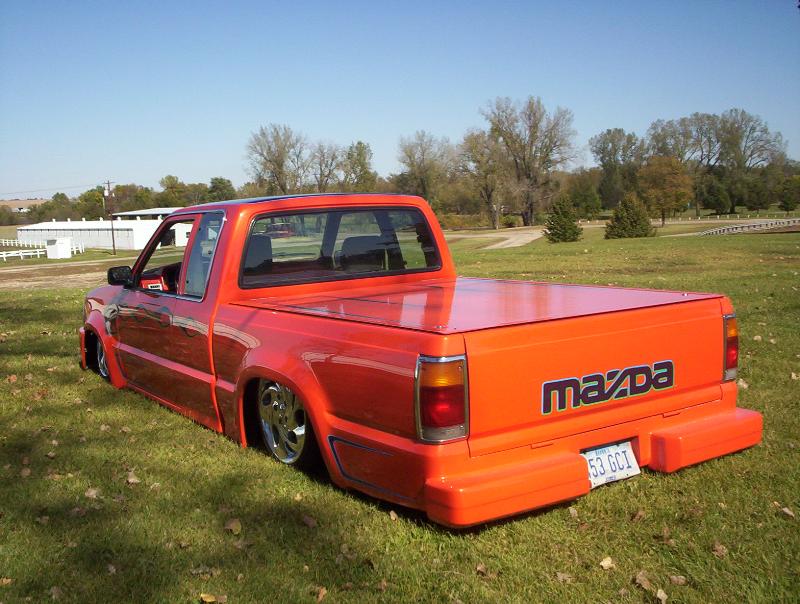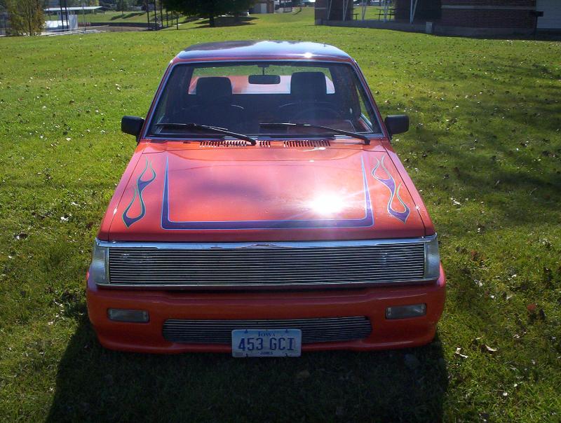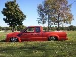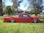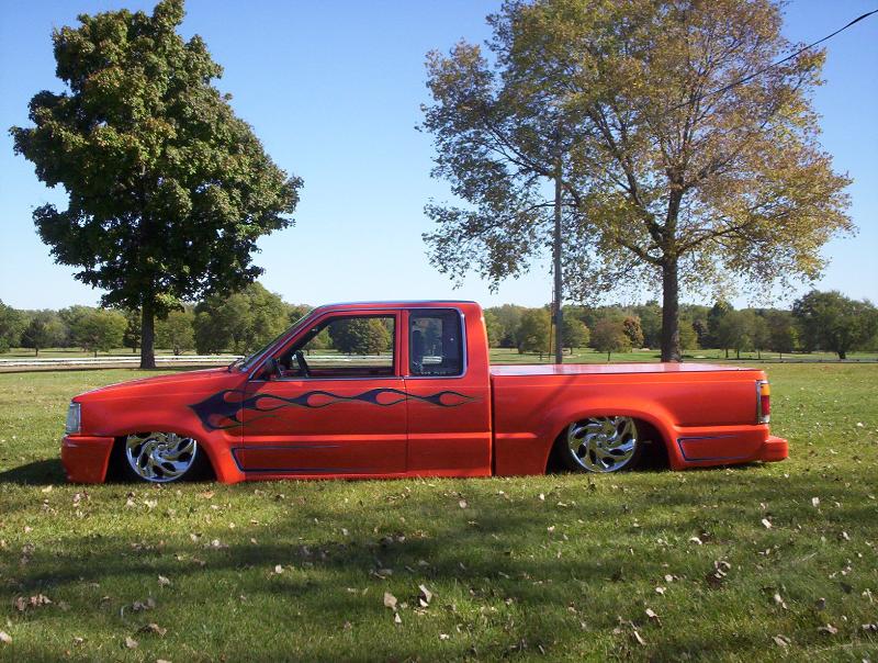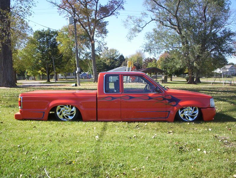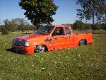 bdy drpd 2 1/2, shaved entenna,door handles,emblems,box seams.split and molded rear bumper to box.toyota chrome front bumper welded together and lengthend on sides .skirted front wheelwells on 4x4 sheet metal.custom mix candy orange and candy purple old school paint job.all work done by myself at MIDWEST CUSTOMS 319-551-0818