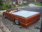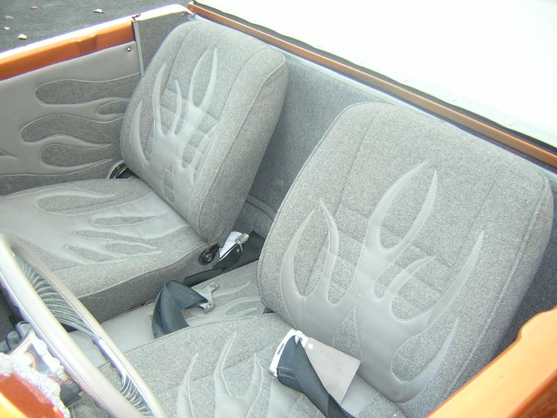 tweed with flames stitched in seats and door panels, fiberglass painted dash, custom steering wheel