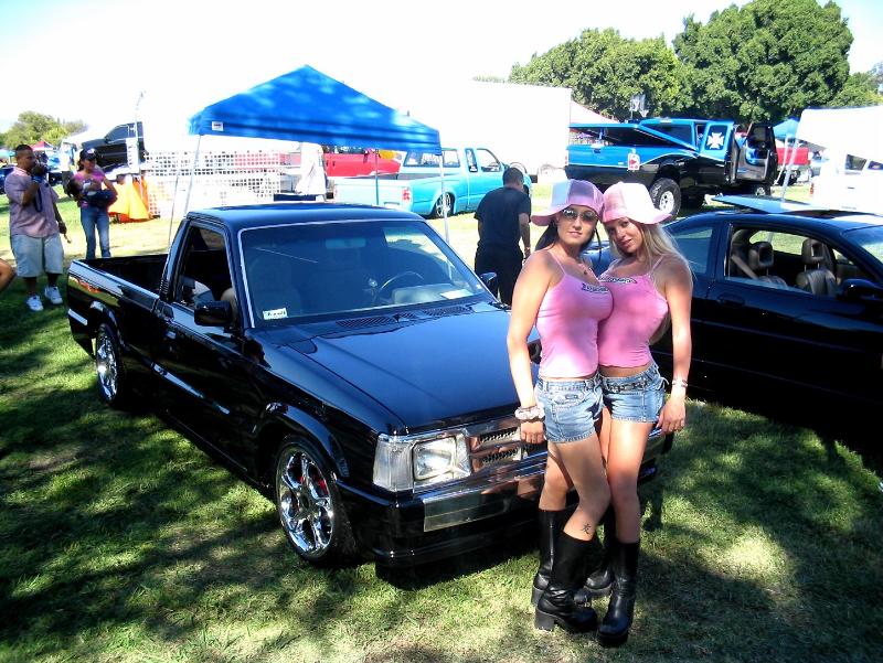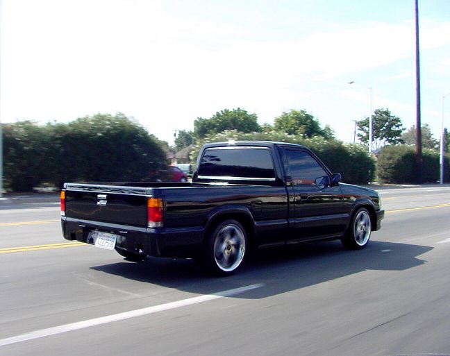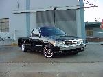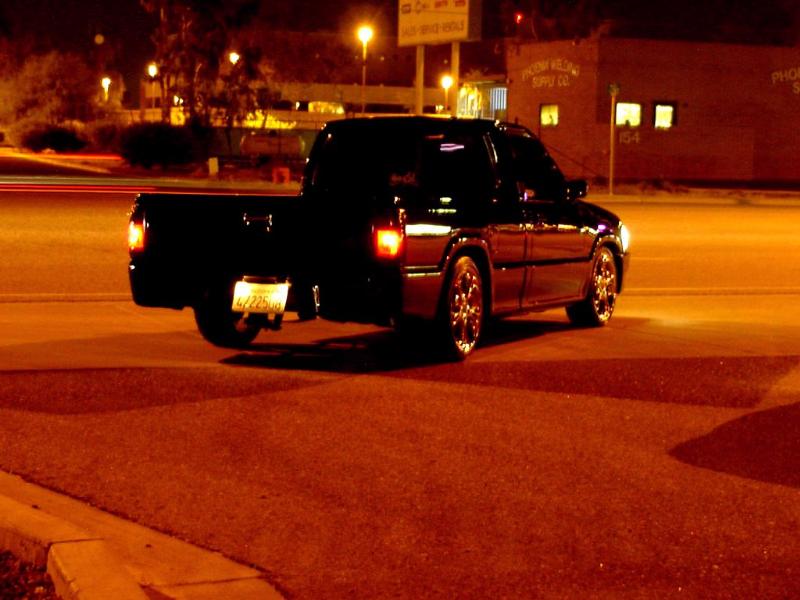 The truck was block and the emblems were shaved off. The paint is from DuPont and the color is Pitch Black. Body work and paint job was done by Angel's Auto Body in Huntington Park, California. For lights it has H4 conversions with PIAA's super plasmas HID and APC clear corners and bumper lights. Front clip is stock but chrome.