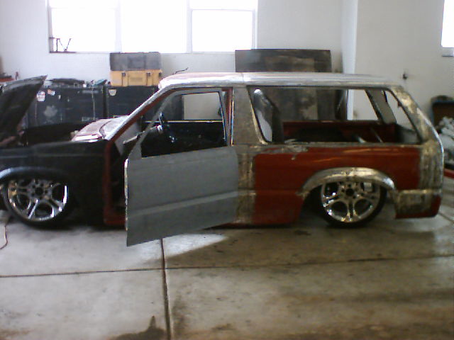 everything is shaved. the bed was shortend 28" for the blazer roof. suicide doors and reverse tilt hood and a shaved fire wall. the fenders were flared 3" to clear the wheels so i can turn all the way down. they are not 4x4 fenders!