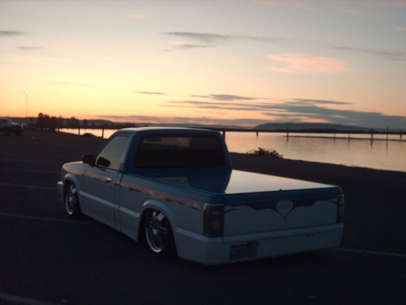 Completly replaced the bed floor and bodydropped it all the way up. Shaved the antenna hole, cab seems, gas filler door (relocated to center of filler panel under bed floor and access by dropping the tailgate). Added a roll pan and frenched in the plate box. B2600 hood and custom paint by JRS Kustoms. Mazerati blue on top with pure white on the bottom, broker up by 4 coats of candy magenta traditional flames with real fire inside. Pinstriped by Dave with Austin Pinstripeing. All graphics and stripes into the jams. Thanks Jeff. Sponge says your gay!