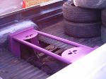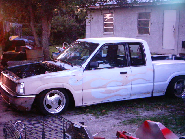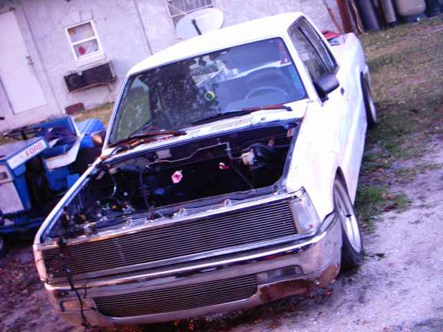 Light Gray Primer, with spray painted Pink flames on the driver side. Shaved Tailgate. Toyota 4-Runner Bumper. Full Billet Grill.