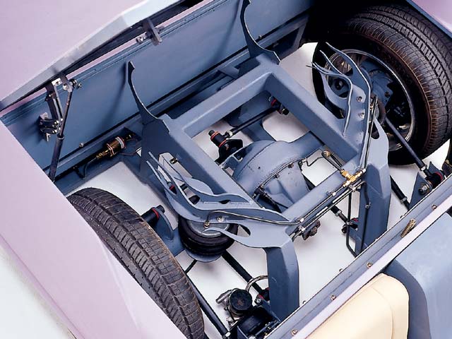 hand fabbed, flamed bag mounts, 2600s in back and 2500s in front, hand fabbed 4 link with Watts link. tubular hand fabbed upper and lower arms in front, tacoma rack and pinion steering from the right hand side.