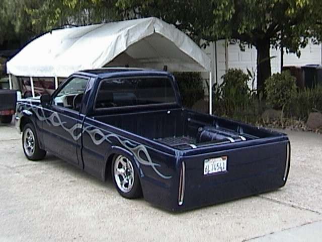 Shaved handles, antenna, gas door. Tailgate skin with caddy lights. 4 runner bumper. shaved mazda signature sideplate.