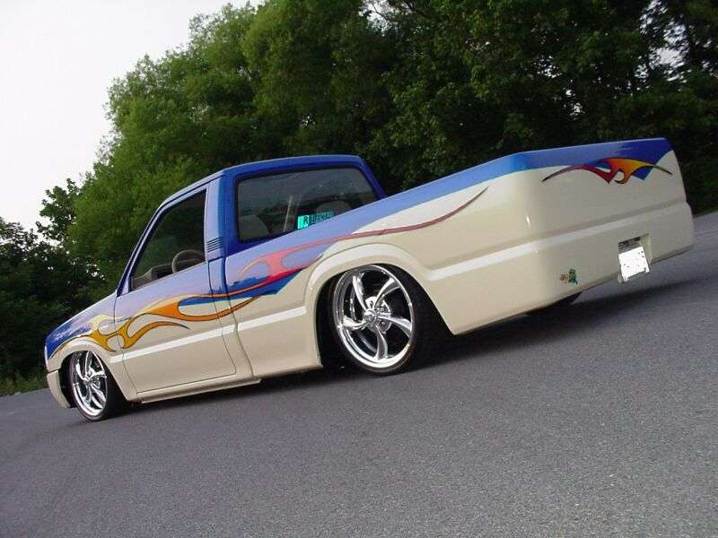 Shaved body line, tailgate, tailights, door handles, cowl, gas door, bed has been smoothed out. HOK Truble & PPG cream using Sunrise, Sunset, & Magenta pearl conclude the paint scheme