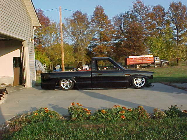 Frame has been com-pletely sandblasted and painted Black, with all the suspension powder-coated Blue. Firestone Bags and Pete&Jakes 4-link.