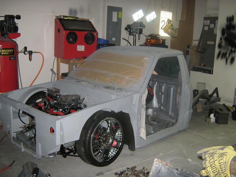 engineered stock floor body drop, dropped engine trans and carrier bearing 1/2" custom tabs, brackets, body mounts, 4 link, and all the other stuff nothing bought here! factory front clip welded up and ground smooth to flow with the rest of the frame, 2 3 gallon tanks and 12 gallon fuel cell mounted in rear, 2600 firestones on the bars in the rear 2500's up front, shocks all the way around, bed tilt, yada yada yada