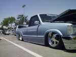 Color is Bayside Blue Metallic (PPG), shaved emblems, tailgate, rear lights, molding, gas door (relocated in bed), antenna, door handles and key holes. Smooth and tubbed bed. LED brake lights and 3rd brake light. Toyota 4wd chromed bumper and valance. Slim Top bed cover with electric pistons for remote opening and closing. Aeromach chrome hot rod mirrors, Maltese cross with snake arms. Dual German Helahorns (located behind bumper). Blow-through for stereo welded to back of the cab. Body dropped 2-3/4" (work performed by Slaughter House).