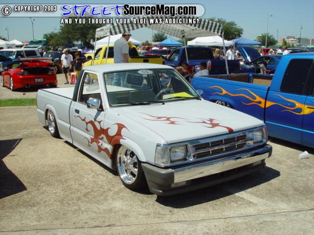 inside of the bed has been smoothed w/ new sheetmetal. shaved gas door and emblems, smooth roll pan. shaved antenna and tailgate latch, chrome door handles pearl white and metal flake red for now