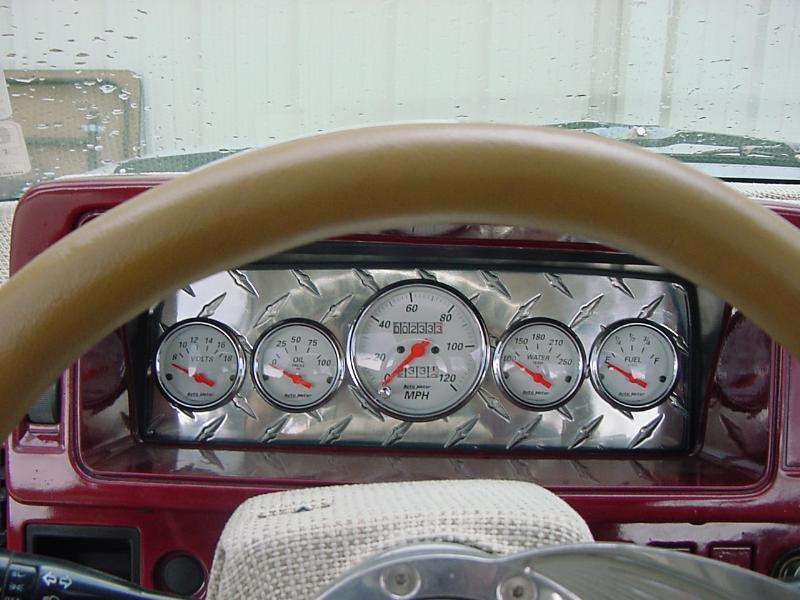 billet steering wheel, tweeded and painted dash autometer platinum gauges mounted in diamond plate