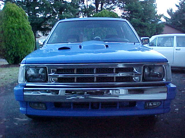 paint is blue. my grill and bumper is chrome aswell as all the trim. curved signal lights in the air valence with small vents on the bumper endcaps. Clear lights all around and a sidways licence box in my shaved tailgate.