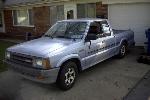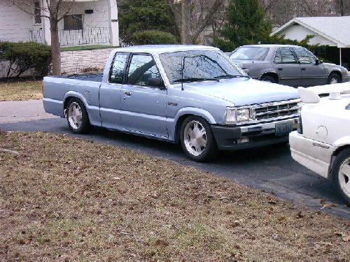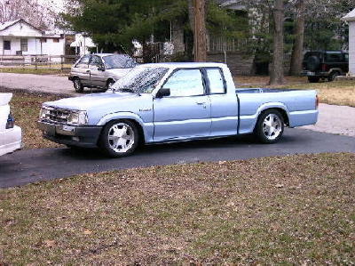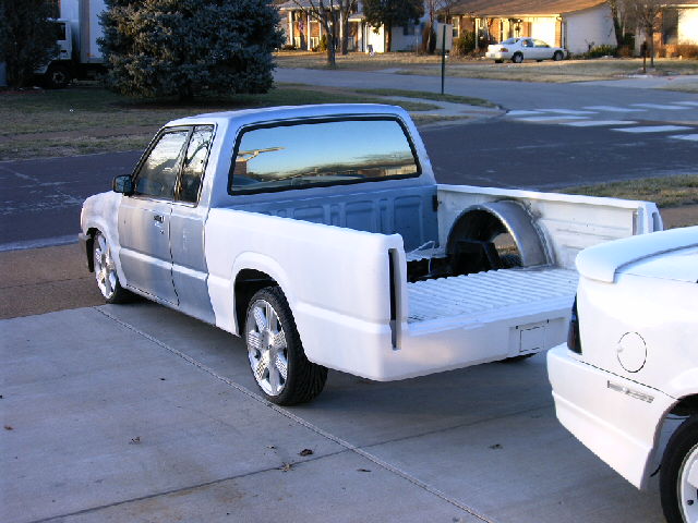 Chrome front bumper and grille, clear corner and bumper lights, shaved door handles, cadillac tail lights, mirror window tint, power removable sunroof, APC H4 conversion headlights. B2600 hood and shaved fenders and cowl wheel tubs in the bed and under the hood