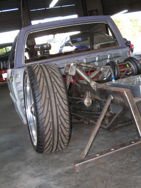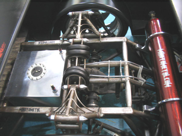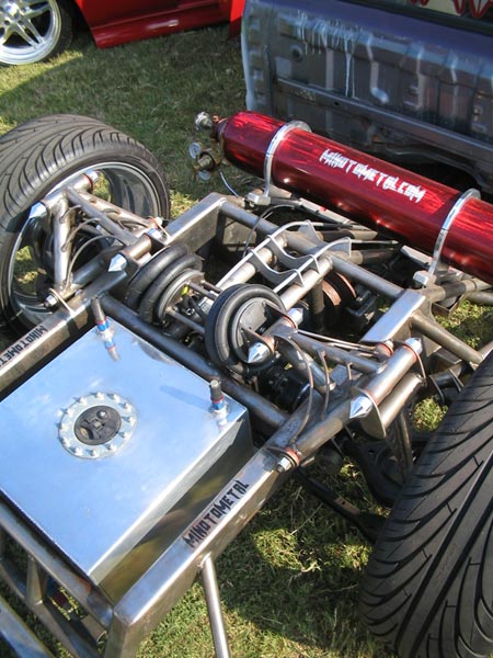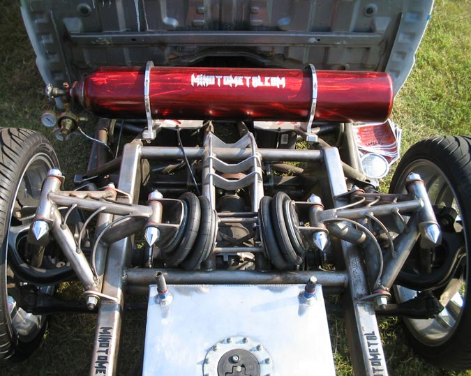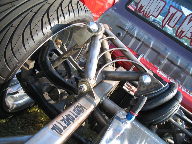 3/8" Herion valves, Slam's RE7 bags all around. 240 SX IRS (got rid of the 4 lug). One off front and rear A-arms. Cantilever rear setup. stainless 3/8 air line.