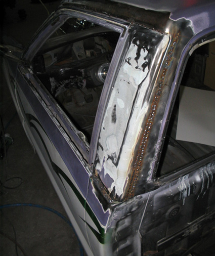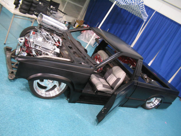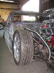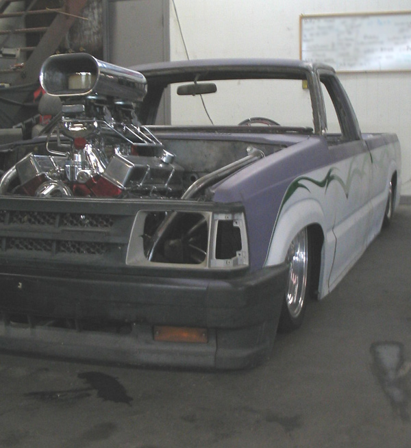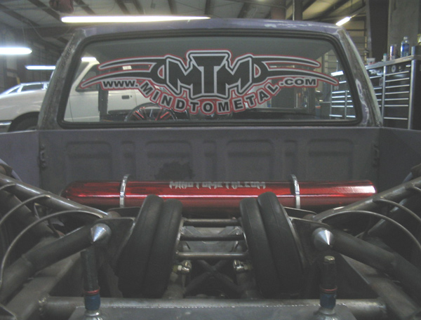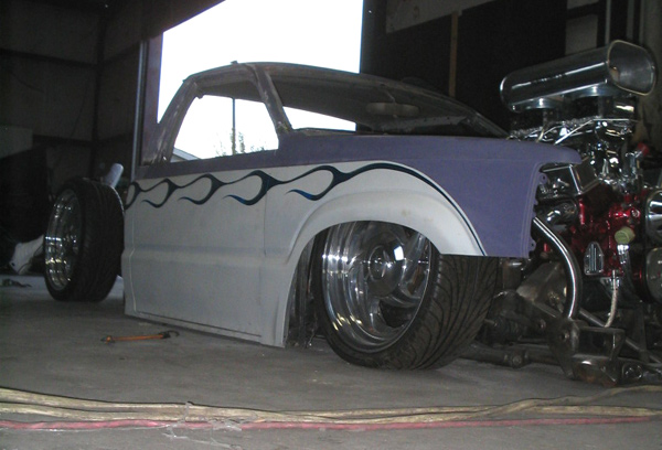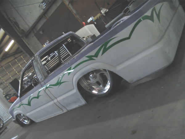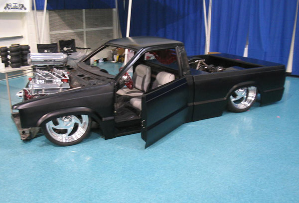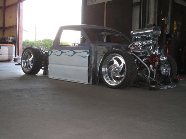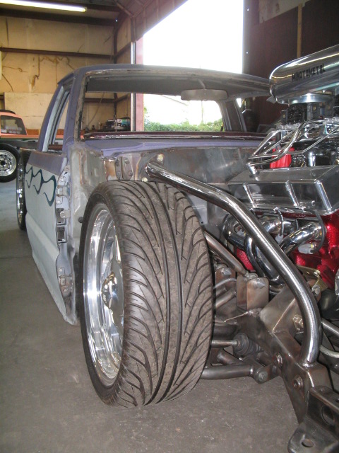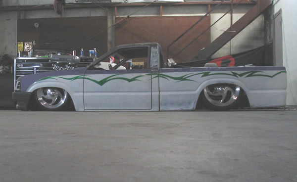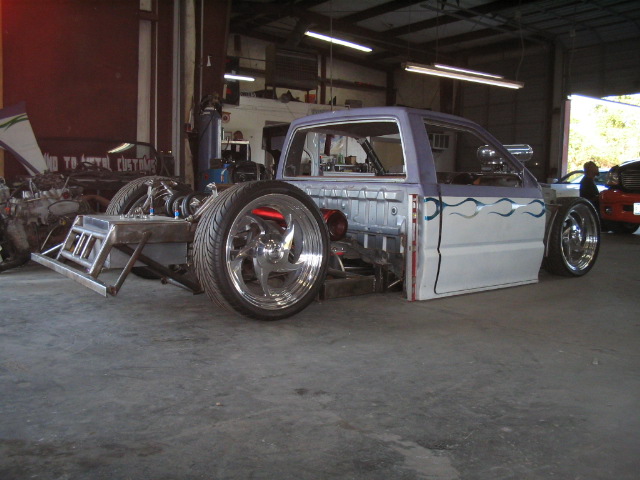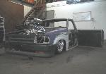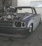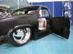 Fully shaved. Body dropped 4 1/2", 2 1/4" Chop Top with stock back glass.. Truck is now 45" tall. Suicide doors. Molded side window frames. sheet metal bed. flat black for now..