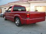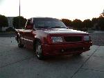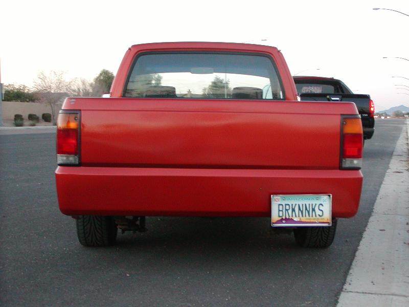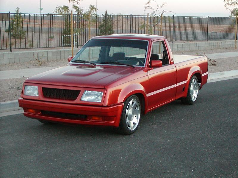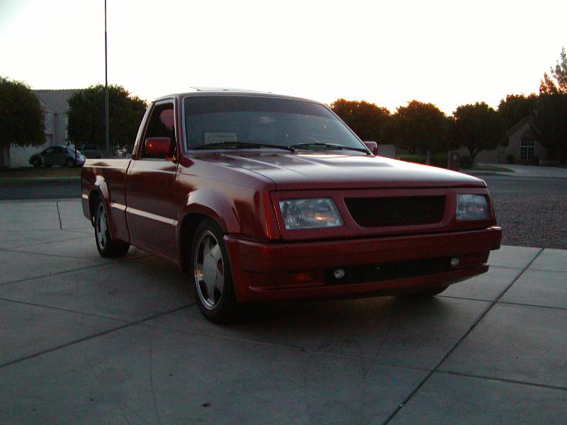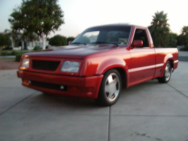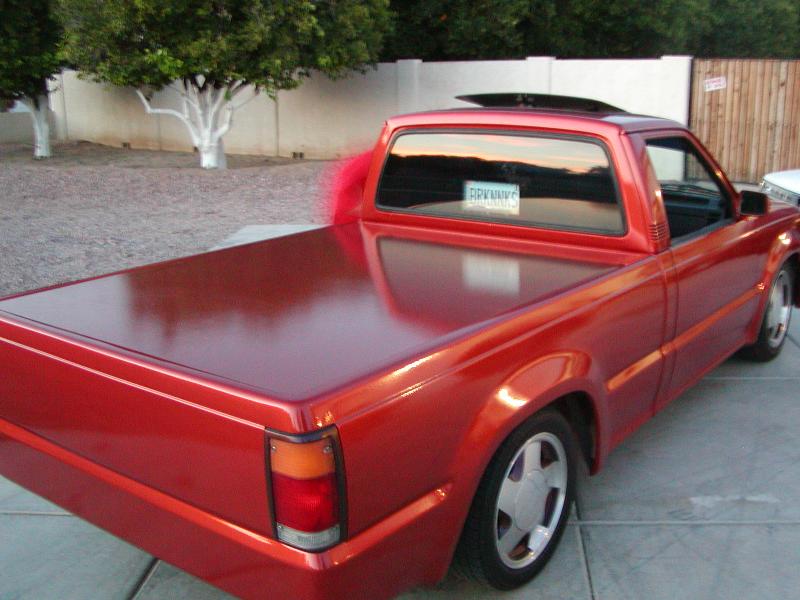 Dodge Neon Burnt Orange with Prowler pearls added. Shaved handles, corner lights, rollpan, tailgate welded shut, Sunroof, 1/8" Steel bedcover, 4x4 fenders and bed. Paint will stay like this till truck is done and then get full color change with graphics. Audi headlights with a custom grill. Chrome license plate bracket.