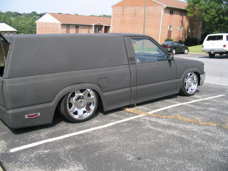 flat black primer, 17" escalade wheels, cadillac taillights, 2003 cadillac license plate holder and reverse light set up, 1968 cadillac rear side markers toyota chrome front bumper and lower valance, shaved handles, tailgate, and wiper cowl