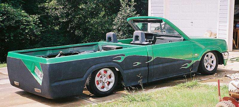 black primer with metallic green flames. soon to be solid black primer.shaved door handles,shaved mirrors,shaved wipers, skinned tailgate, shaved tailights, homebuilt phantom style grill, toyota bumper,shaved emblems, topless,shaved gas door.