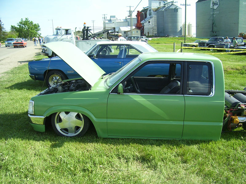 Shaved doors, antenna, cowel, tailgate, emblems, fuel door. toyota 2w front end and billet mazda grille, stock-floored 2 inches to pinch mold, motor dropped 1/2 inch, relocated gastank