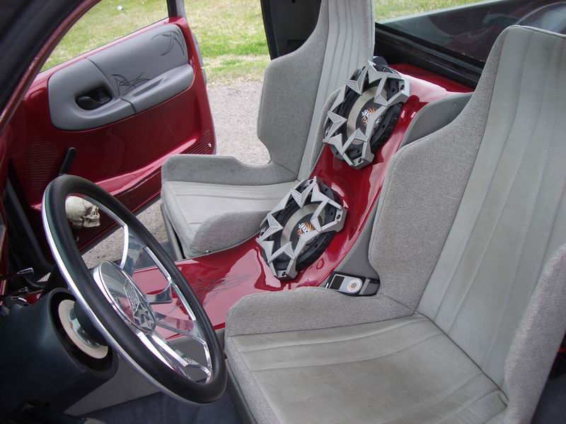 Smoothed and Painted in a deep red pearl, Center Console w/ Subs, Racing Style Seats that are uncomfortable as hell, B.A.D. billet steering wheel to match the Bonspeeds
