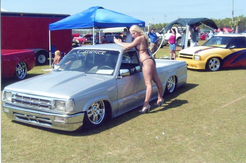 Body droped,Shaved handles ,tailgate, antena, molded in roll pan, smooth wiper cowl, s10 cowl molded into stock mazda hood, sheet metal bed,chrome grill, yota front bumper, shaved side markers, diamond motor cycle mirrors..