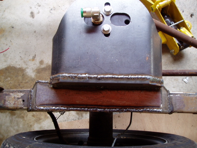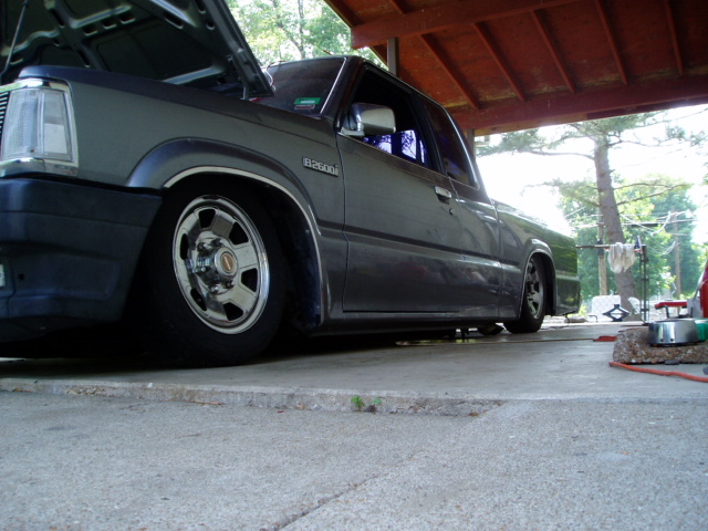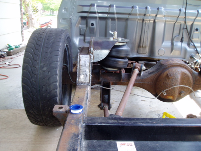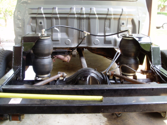 full air ride. 2 M.I.C. 1/2" mass-flow valves, 2 M.I.C. white face gauges, 1/2" air line, 2 compressors, 2 5 gal. tanks, 4 2500 bags, reverse triangulated four link, 6" monster notch. front/back right now.