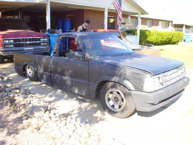 Shaved door handles, no tailgate at the moment, molded roll pan, led's in place of the stock tail lights, crappy flat black paint or whats left of it.