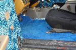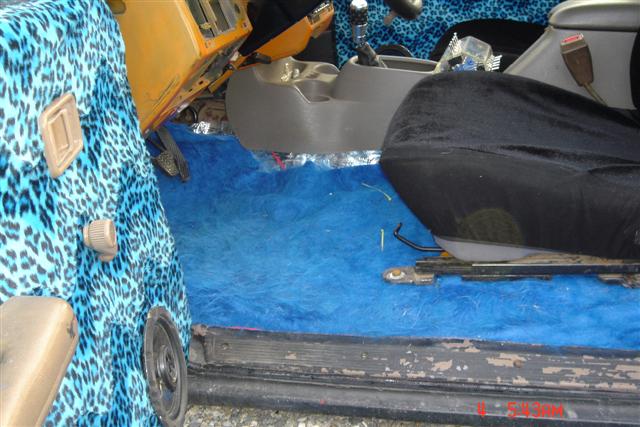 Smoothed dash, painted Black, custom bucket seats, lowered seat brackets, blue leopard door panels, blue shag rug, gtant GT steering wheel,