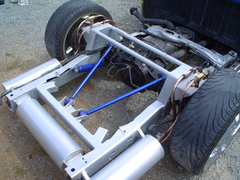Lowered I-Beams, Relocated radius arms, raised tranny x-member, Slams all the way around, Reverse Triangulated 4 Link in rear, with a monster notch and 3/8 port bags. 1/2 Brislands valves, custom made tanks, copper hardlined, with a scubba tank and a sanden belt driven compressor, on a homebuilt mount. got the new frame got tubular a-arms, slam RE-7 all the way around, Forward facing 4 link from Suicide. All work going to be done by me, at my shop. :)