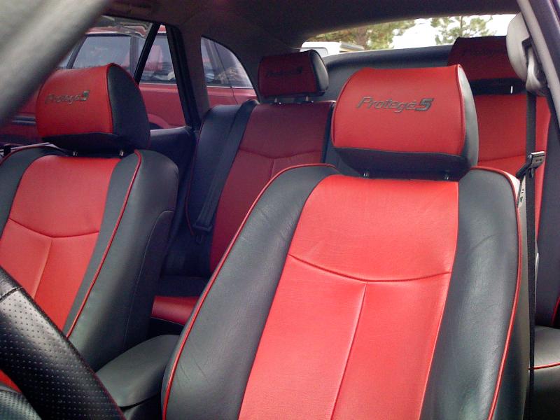 Custom red leather seats with protege 5 stitched in head rests, red carbon fiber dash kit, red neons under dash.