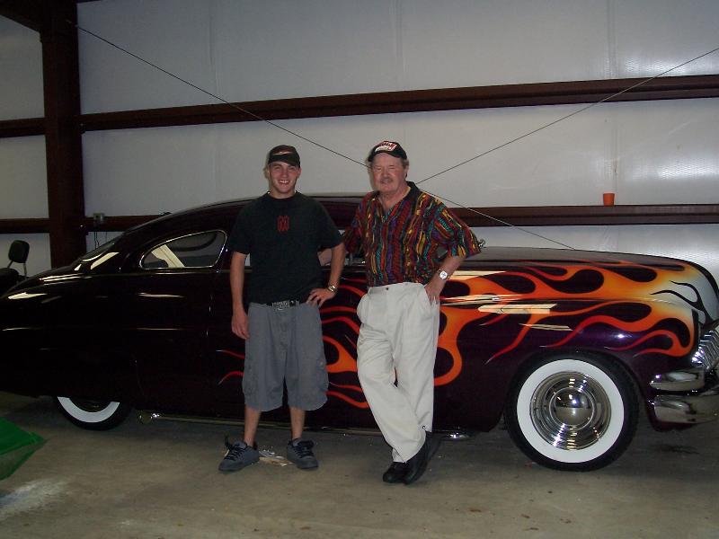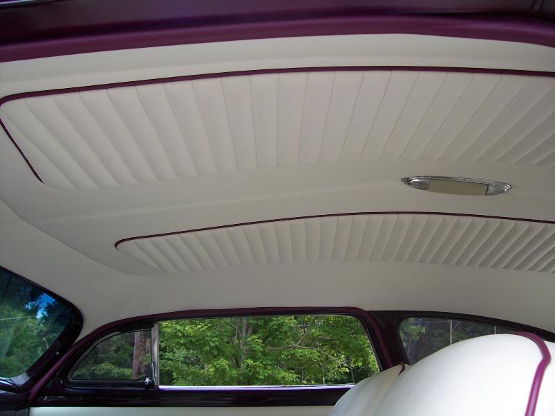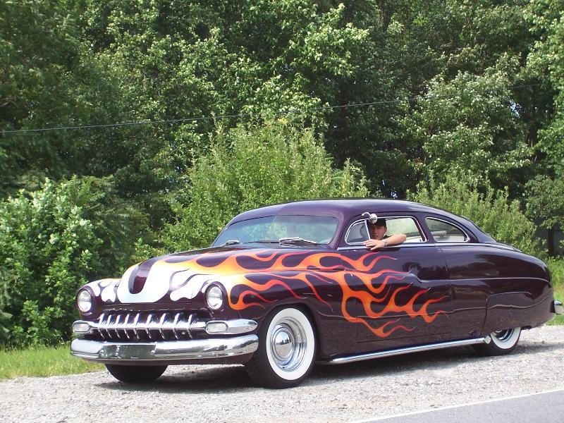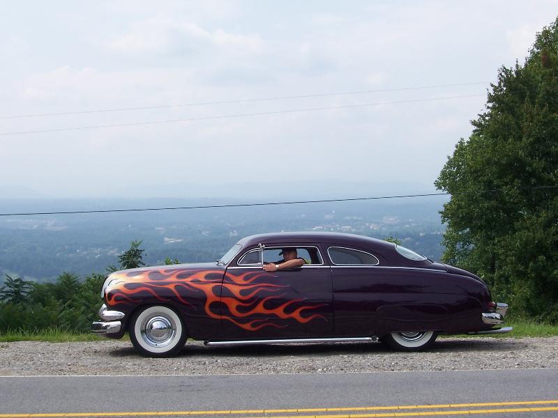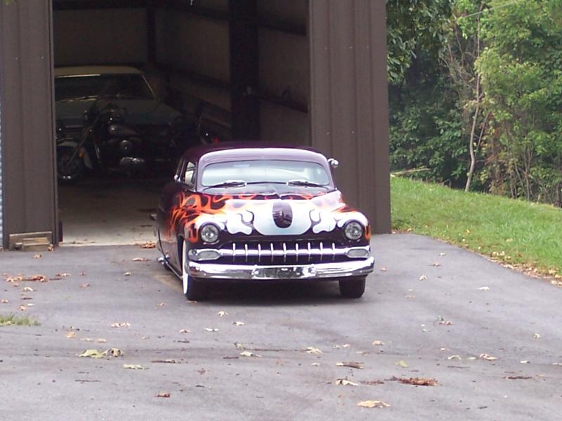 dark purple with hot rod style flames, frenched tail lights, 3 1/2" chop top, billet LED third brake light, shaved handles and what not, 54' front end