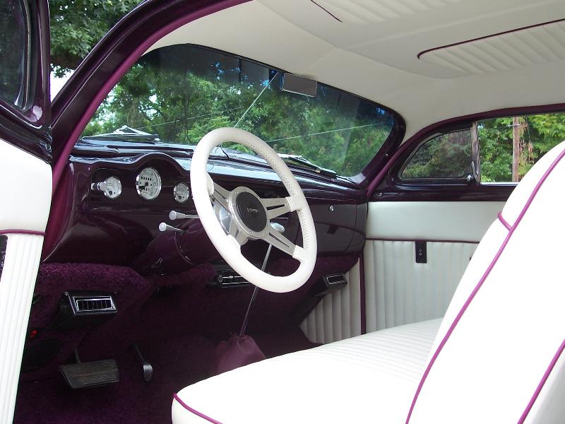 white leather with purple accents, painted dash to match, shag lookin purple carpet, tuck n roll seats, matching head liner, power windows