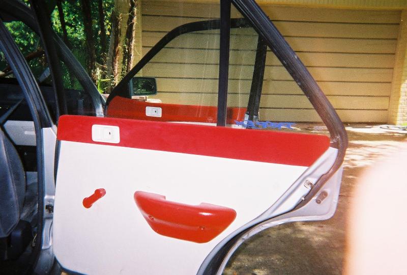 white leather for door panels and roof, shave door looks, red velvet interior.