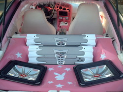 The interior is wrapped in vinyl and leather. Every panel is wrapped in white vinyl and the seats are wrapped in white leather with pink vinyl. Fully custom interior is done in the car including white carpet.