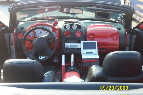 6 color indiglo gauges with speedhut brushed aluminum gauge bezel, OBX three piece pedal set, OBX chrome e-brake handle, APC automatic shift knob, custom embroidered spiders in head rests, aluminum heel rests, shift light, APC oil and volt gauges in the clock pod,( red vinyl hand grips, brake boot and arm rest all hand sewn), red neons under the seats, strobes under the rear speaker grilles, ps one, portable panasonic 7" screen dvd player on custom stand from a huey helicopter, mobile audio 5.6" screen tv, custom fiberglass interior by me, fiberglass spare tire cover, APC fire extinguisher