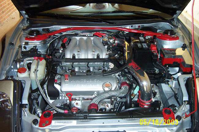 3.0 V6, Injen Cold Air Intake,Oil cap and Fuse box Cover by injen, AEM underdrive pulley on alternator, Blitz Radiator Cap, custom red paint under hood, K&N crank case vent, chrome battery tie-down bracket, chrome bolt covers, custom made aircraft aluminum heatshield for cold air intake, Spoon magnetic oil drain plug, chrome radiator overflow tank with red annodized cap