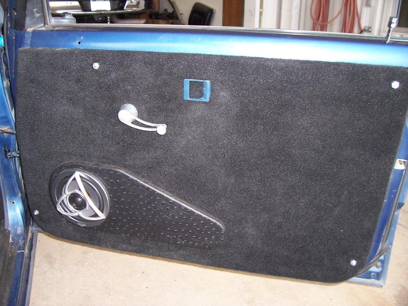 Geo metro buckets, billet window cranks, black door panels with ostrich, blue tweed dash, black carpet, killed and skinned cookie monster for my headliner
