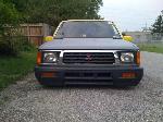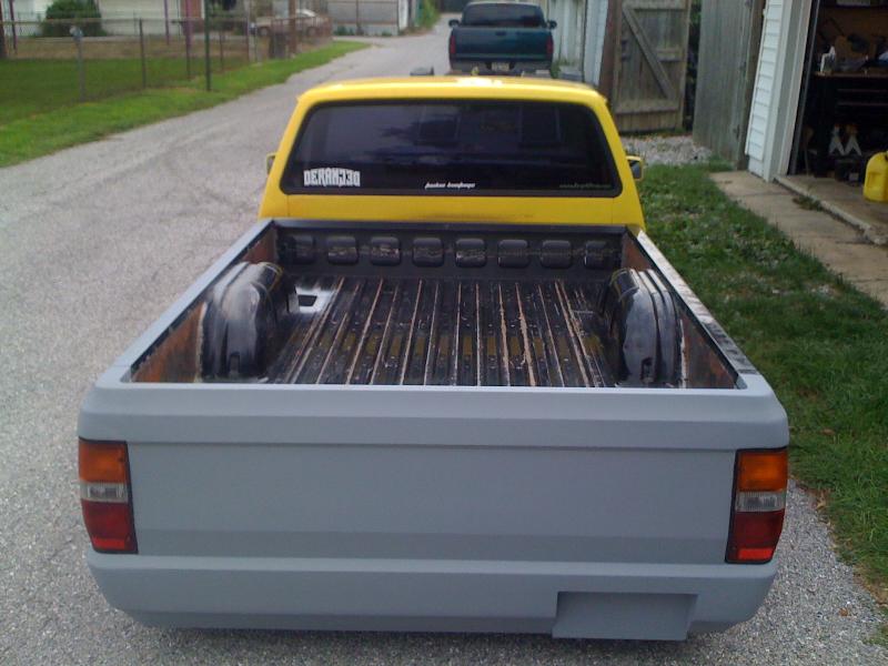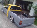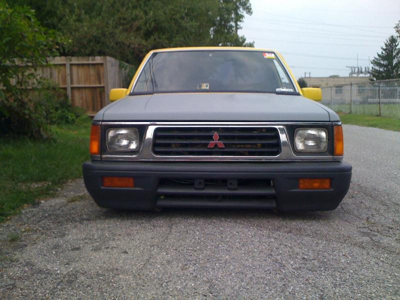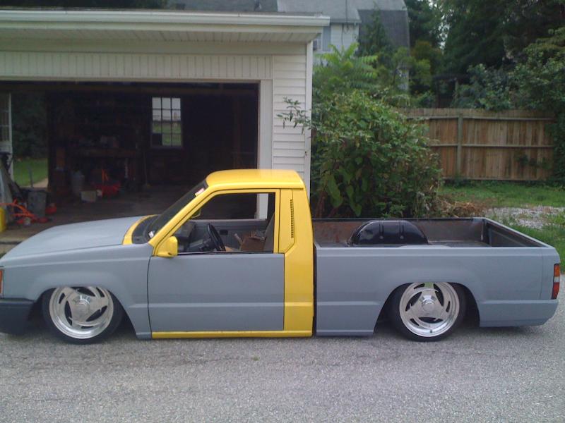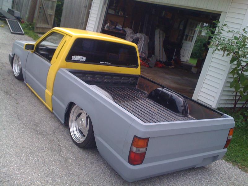 bodydropped,raised bed floor 6 inches, shaved handles , replaced grill and fenders back to mitsu, shaved gas door and relocated to bed floor , shaved inside bed walls , rear skin combo , eclipse hood bubble grafted in hood , squirters gone , rear cab light gone