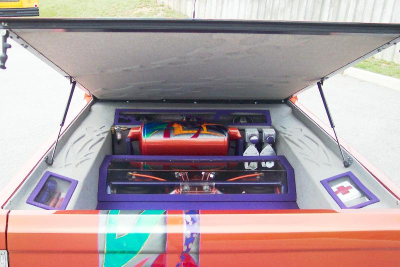 Shaved all handles,locks,antenna,all body seams, eclipse bubble in hood,vw/fuba antenna mounted where cargo light used to be,smooth roll pan, custom bumper, '99 Isuzu copper orange metallic w/ 14 color graphics & bodydropped 2 1/2"