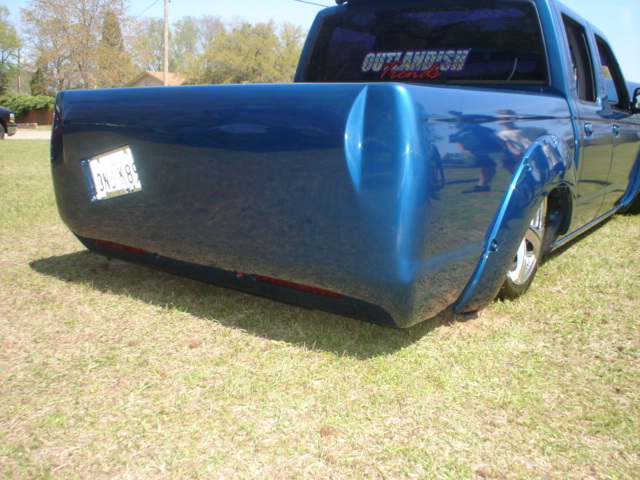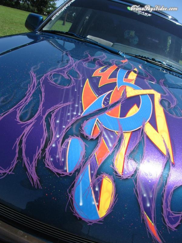 purple flame on hood w/ graphics inside, shaved emblems, hood squirters, antena, third break light, and tail lights, molded tailgate and roll pan with frenched license plate, smoothed out inside of bed w/wheel tubs, frenched license plate in front bumper, color matched handles, and slidding rag top!!!