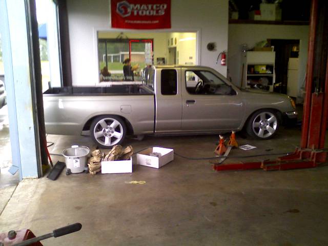 Lowered with 2" belltech drop spindles, cranked torsion bars, 4" AIM blocks, pulled leaf, airshocks in the rear, chassis tech shocks up front, pancake bump stops.