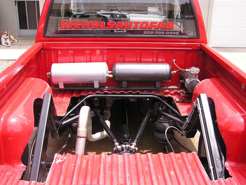 WELL....THE FRONT IS BAGGED WITH 2500 FIRESTONES. THE BACK HAS BEEN 4LINKED AND BAGGED BY NICHOLS AUTOFAB (928-708-0300) ALL THE TUBE WORK AND BAG MOUNTS YEA WELL HE DID IT. THE NOTCH ON THE OTHER HAND WAS THE BRILLIANT IDEA OF MINE TO BE DIFFERENT FROM EVERYONE ELSE NOW I KINDA DONT LIKE IT.