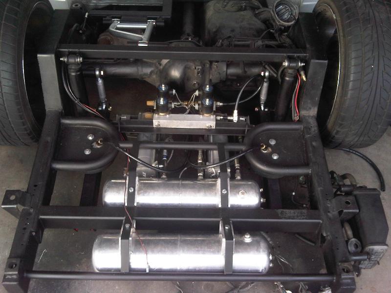 bagged with 4 link and a wishbone, 2 air zenith comps and 2 5 gallons all under the bed. reworked arms and tubbed firewall. 2in drop spindles. lays full frame on 20s.
