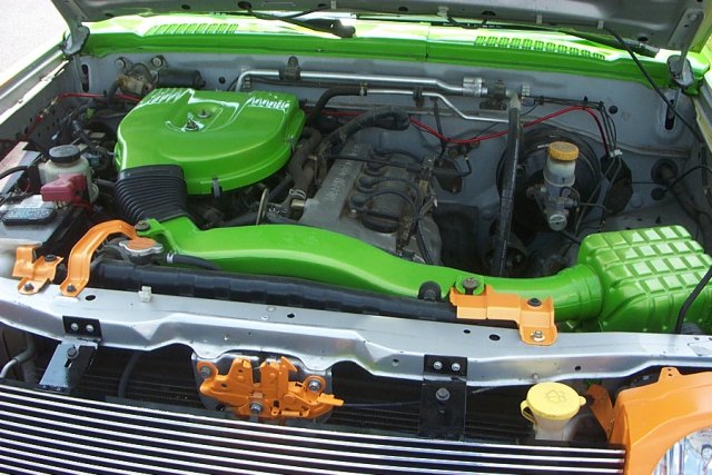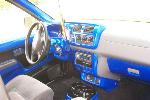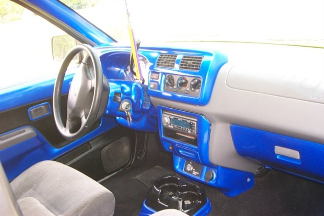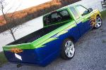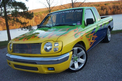 Shaved taillights, rollpan, smooth tailgate skin with LEDs, 03 xterra headlights, billet grille and bumper inserts, painted lime green and electric blue with yellow and orange tribal flames