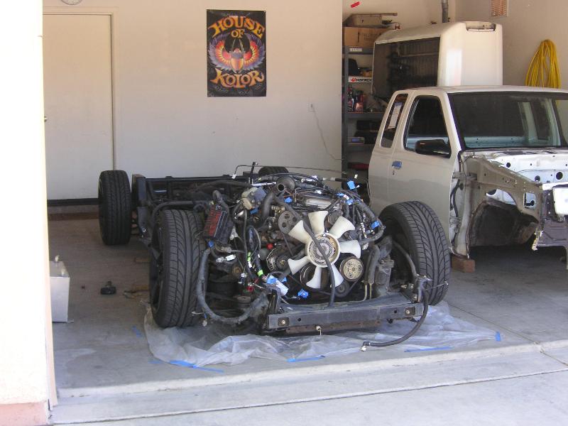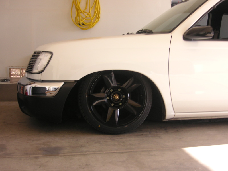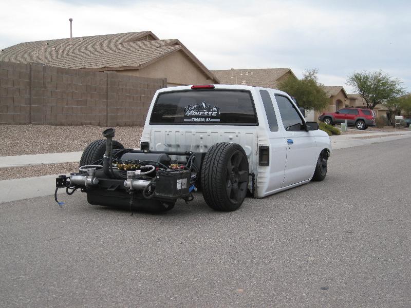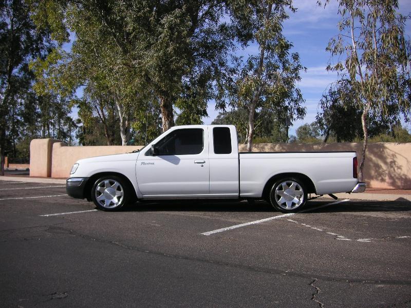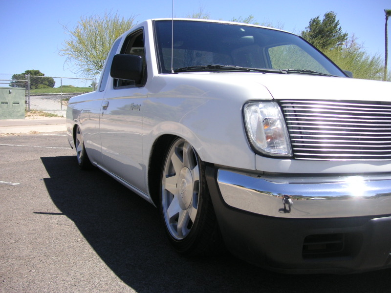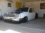 4" Body drop (2.5" stock floor, 1.5" traditional), tubbed for a 27" tire, Clear corners, 6k HIDs, 98-99 Frontier tails(clear reverse light), phantom grill, tint, solid rear window, checkermate tonneau cover, relocated handle, platebox in tailgate, smooth roll pan, shaved cowl, street scene mirrors