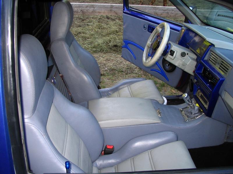 seats and custom console covered in a mix of lighter and darker blue vinyl