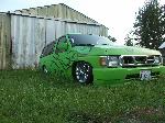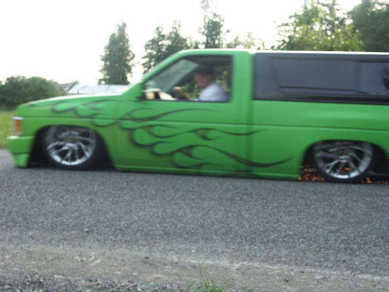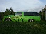 3"Body drop, shaved gas door, emblem, antenna, hood squirters,cowl, door handles and 3rd brake light, frenched plate box in tailgate skin, roll pan, 92 Toyota bumper w/plate box & shaved signals W/96 Tacoma valance, Clear Tail lights, Leer shell W/Blazer windows.