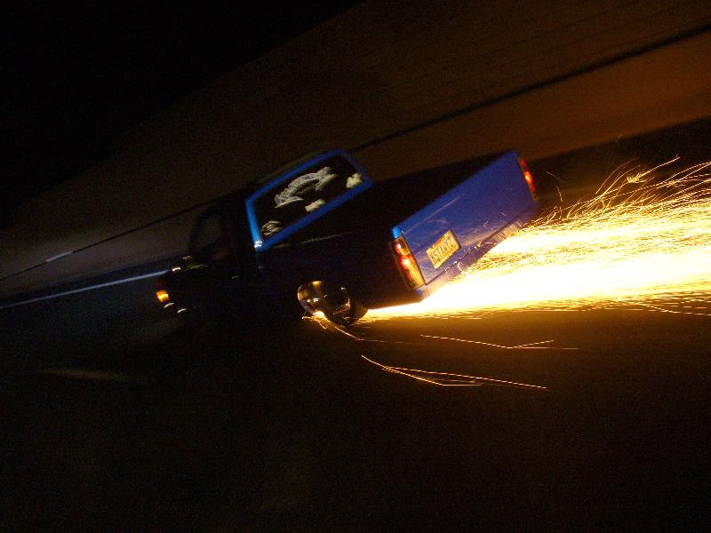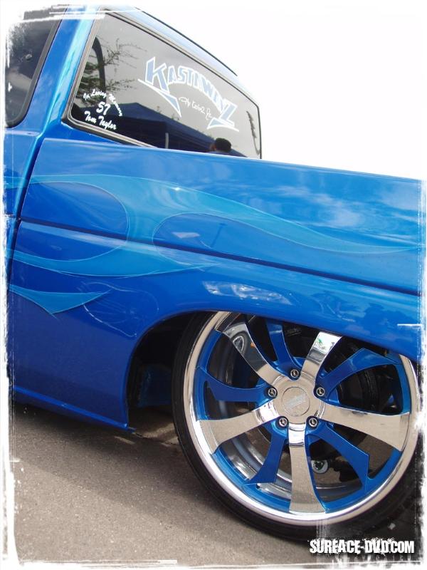 HOK True Blue paint, with custom HOK Baby Blue Flames(designed by Nick Crouch of www.Surface-dvd.com) Line-X bedliner, euro taillights, 5 lug swap, big ass rag top, Frontier tailgate shaved. Billet grille, clear corner lenses, shaved cowl, shaved antenna.