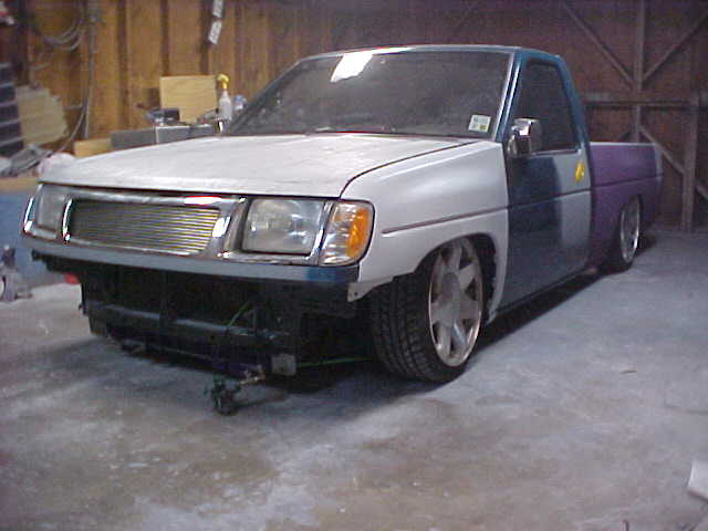 2000 Frontier front clip, honda civic door handles, shaved fuel door, shaved hood squirters, shaved antenna, cali combo in rear. custom rear frame clip with built in tank and compressor rack, smooth and painted frame, frame is House of Kolors Passion pearl, spindles,control arms, four link, driveshaft and rear end are painted House of Kolors Limetime pearl.