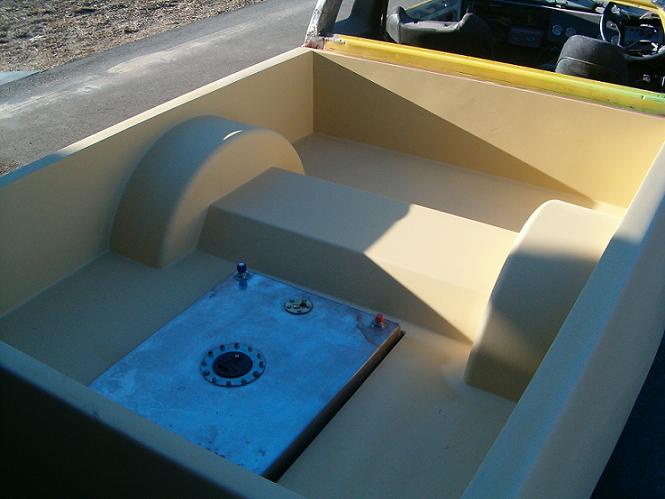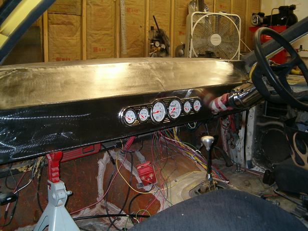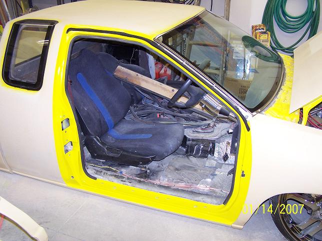 Honda Del Sol buckets. Hand made sheetmetal dash to accomodate the right hand drive conversion built with a Saturn rack and pinion, "Borgeson" polished stainless steel u-joints and splined shaft, and a chrome "IdidIt" steering column, firewall mount, and column drop. Dash, center console, and subwoofer enclosure will all be molded together. Chrome "Lokar" tailmount shifter. The truck is wired up with an 18 circuit universal "Painless Wiring" kit. "Autometer" gauges.